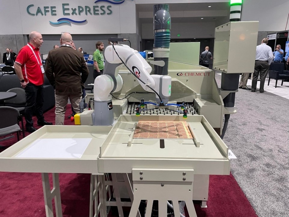 Along with the 2300 series machine, were two loading bots on the input and output of the machine. These bots were shown off last year at the previous IPC show too, but this time a different layer was added. To simulate a typical printed circuit board shop, we incorporated the loading process to account for interleafing. Through this, the loader bots go through a series of motions. At the input, the loader bot would add a panel to the conveyor, and then pick up the interleafing material, put that aside in a separate tray, and repeat. The reverse of this process happened on the output end of the conveyor where the panel was picked up, and interleafing was then picked up to be placed on top of the panel. This showcased the range of motions that the loader bot can perform and that it is flexible enough to sufficiently handle any loading or unloading job your wet process may require.