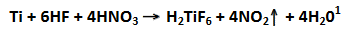 As you can see, by using HF we can effectively etch Ti. However, this reaction causes the production of hydrogen gas (H2) – which is not ideal. With the production of H2, more safety obstacles are introduced because it is highly explosive. To reduce the production of hydrogen during this reaction, nitric acid (HNO3) is introduced into the reaction (see below)