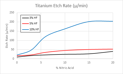 Since titanium is a metal with high corrosion resistance, it is perhaps the most difficult metal to etch. This means it requires etching solutions with high electron affinity – thus only solutions that will etch titanium are Hydrofluoric acid (HF) and Ammonium Bifluoride (NH4HF2 – will refer to as ABF) Although these are both options for etching titanium, HF is the most practical etchant. HF is easier to handle than ABF (although both require extensive safety precautions), and it has an etch rate that is suitable for production. The etch reaction between titanium and HF can be seen below.